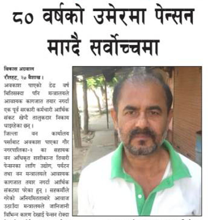 जिल्ला वन कार्यालय पर्साबाट अवकाश पाएका गौर नगरपालिका–३ का सहायक वन अधिकृत शशीकान्त तिवारी पेन्सनका लागि उद्योग, पर्यटन तथा वन मन्त्रालयले आवश्यक कागजात तयार नगर्दा आर्थिक संकटमा परेका हुन् ।