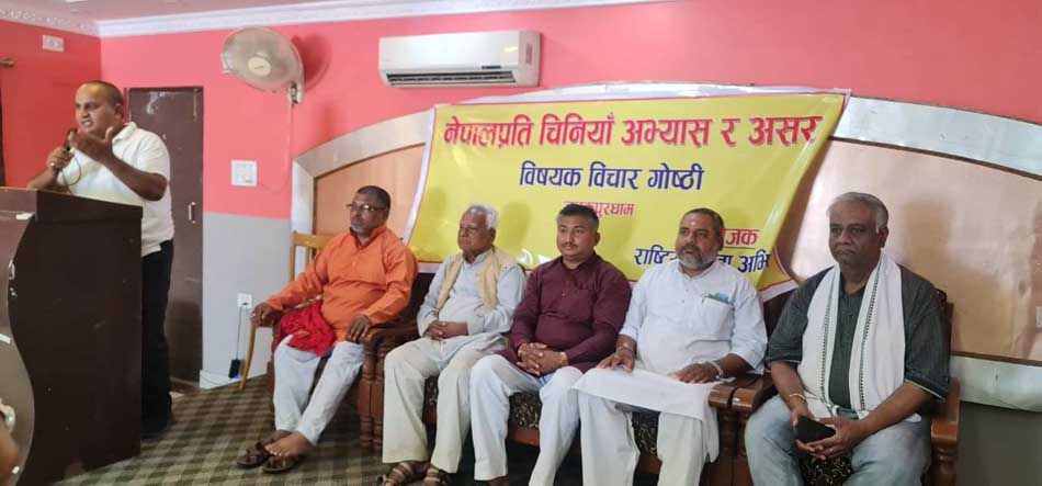 उनले नेपाललाई चीनले तिब्बत बनाउने षड्यंन्त्र गरिरहेको खुलासा गरे । उनले भने, ‘चीनको तिब्बतीकरण गर्ने षड्यंन्त्रको विरोधमा अब सम्पूर्ण नेपालीले एकजुट भई आवाज उठाउने बेला आएको छ ।’ त्यसैगरी गोष्ठीमा साहित्यविद् सुदर्शन लाल कर्णले नेपाललाई श्रीलंका बनाउने रणनीतिमा चीन लागेको आरोप लगाए । उनले भने, ‘चीनले नेपाललाई श्रीलंका बनाउन खोजिरहेको छ, चीनले पोखरा विमानस्थलमा लगानी गरेर विमानस्थल कब्जामा लिने षड्यन्त्र गरिरहेको छ ।’ उनले चीनले बिआरआइमार्फत नेपाललाई ऋणजालमा पार्न विभिन्न कोणबाट कसरत गरिरहेको जिकिर गरे ।
