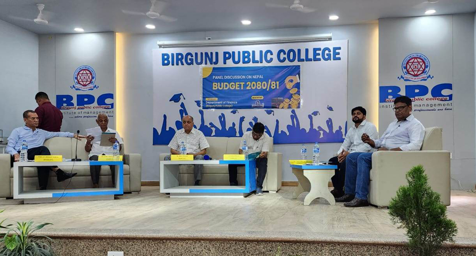 वीरगंज पब्लिक कलेजको आयोजनामा वीरगंजमा बजेटबारे छलफल भएको छ । बजेट कस्तो छ, यसको प्रभाविकारिता कस्तो छ ? मधेशमा सम्भावनाहरु के छन् । पर्यटनमा सम्भावना खोज्न पनि छलफल प्रभावकारी हुने अपेक्षा गरिएको छ । मधेश विश्वविद्यालयका उपकुलपति डा. दीपक शाक्यसहित अर्थविज्ञ, उद्योगी, व्यापारी, नागरिकसमाजको सहभागिता छ ।