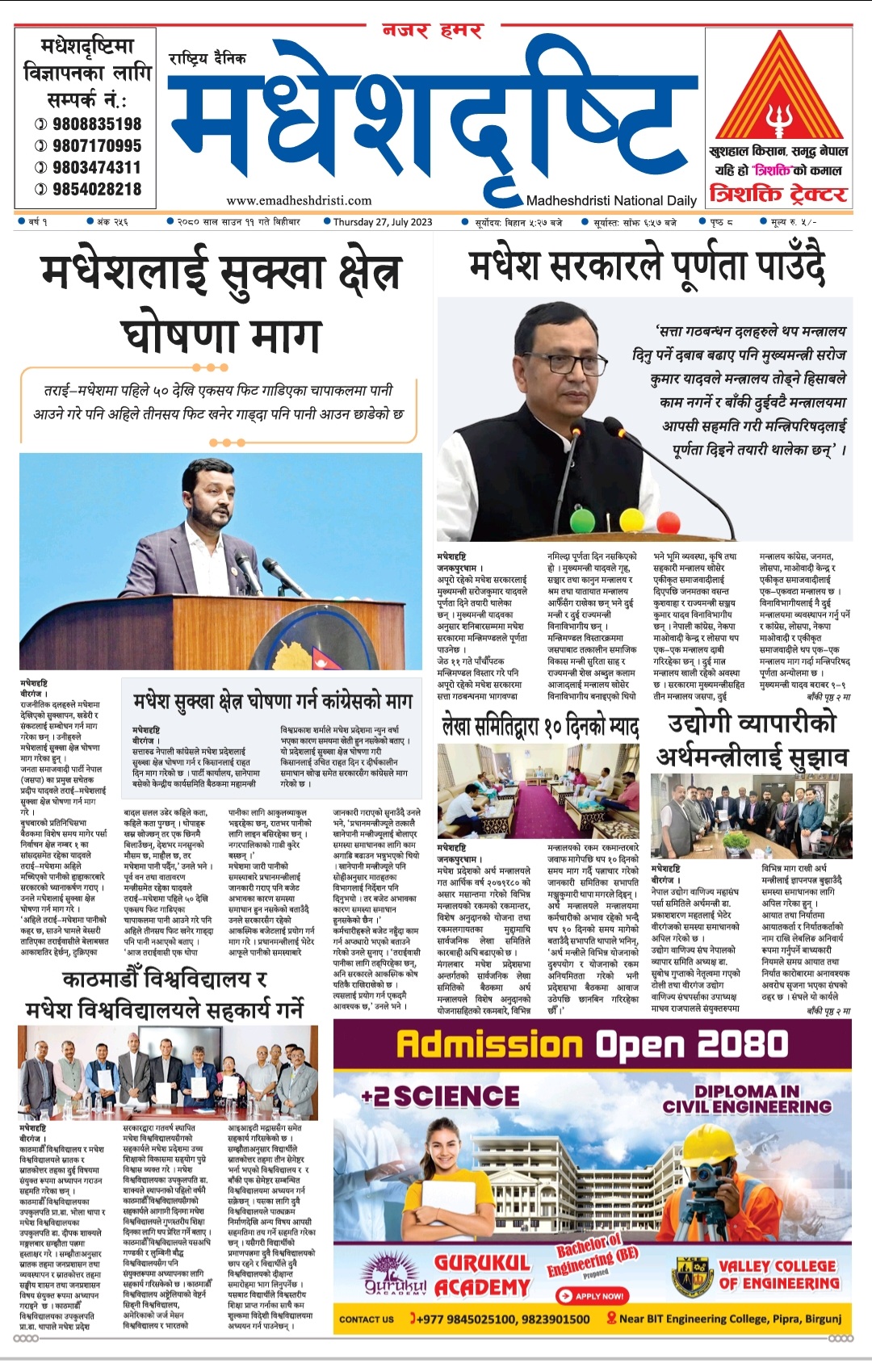 २०८० साउन ११ गतेकाे मधेशदृष्टि दैनिक