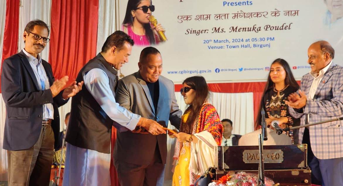 एकता, भाइचारा र सद्भावको पर्व होलीको अवसरमा वीरगंजमा ‘एक शाम लता मंगेशकर के नाम’ म्युजिकल कन्सर्ट भएको छ । बुधबार वीरगंजस्थित भारतीय महावाणिज्य दूतावास र नेपाल भारत सहयोग मञ्चले कन्सर्ट गरेको हो । नेपालकी चर्चित गायिका मेनुका पौडेलको एकल प्रस्तुतिमा कार्यक्रममा उपस्थित सबै रमाएका थिए । गायिका पौडेलले भारतकी स्वर कोकिला स्वर्गीय लता मंगेशकरको दर्जनौँ गीत गाएर कार्यक्रमलाई रंगीन बनाएकी थिइन् ।
