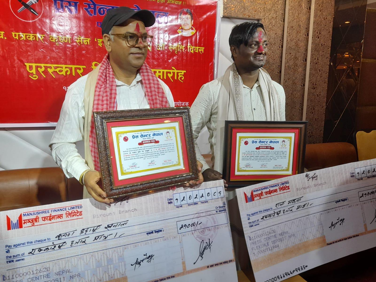 प्रेस सेन्टर नेपाल पर्सा शाखाले स्व.कृष्णसेन स्मृति दिवसको अवसरमा दुई जना पत्रकारलाई पुरस्कृत गरेको छ । कृष्णसेनको २२औँ स्मृति दिवसको अवसरमा शनिबार वीरगंजमा आयोजित एक कार्यक्रमका बीच पत्रकार कृष्ण उदास खनाल र राम मण्डललाई जनही २१ हजार रुपैयाँ नगद राशीसहित पुरस्कृत गरिएको हो । खनाललाई कृष्णसेन स्मृति सम्मान पुरस्कार र मण्डललाई क्रियाशिल पत्रकार पुरस्कार प्रदान गरिएको हो ।