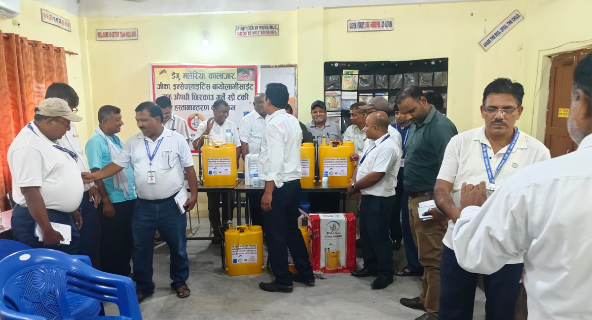 वीरगंज महानगरपालिका वडा नम्बर ३ स्थित महानगरको शैक्षिक तालिम केन्द्रमा स्वास्थ्य कार्यालय पर्साका प्रमुख डाक्टर मुक्तीनारायण साहले वीरगंज महानगरका स्वास्थ्य महाशाखा प्रमुख अनिल यादव, सरसफाई महाशाखा प्रमुख सरफुदिन मियाँ र वडाध्यक्षहरुलाई विषादी र ट्यांकी प्रदान गरेको वीरगंज महानगरपालिकाका सरसफाई प्रमुख सरफुद्दिन मियाँले जानकारी दिए ।