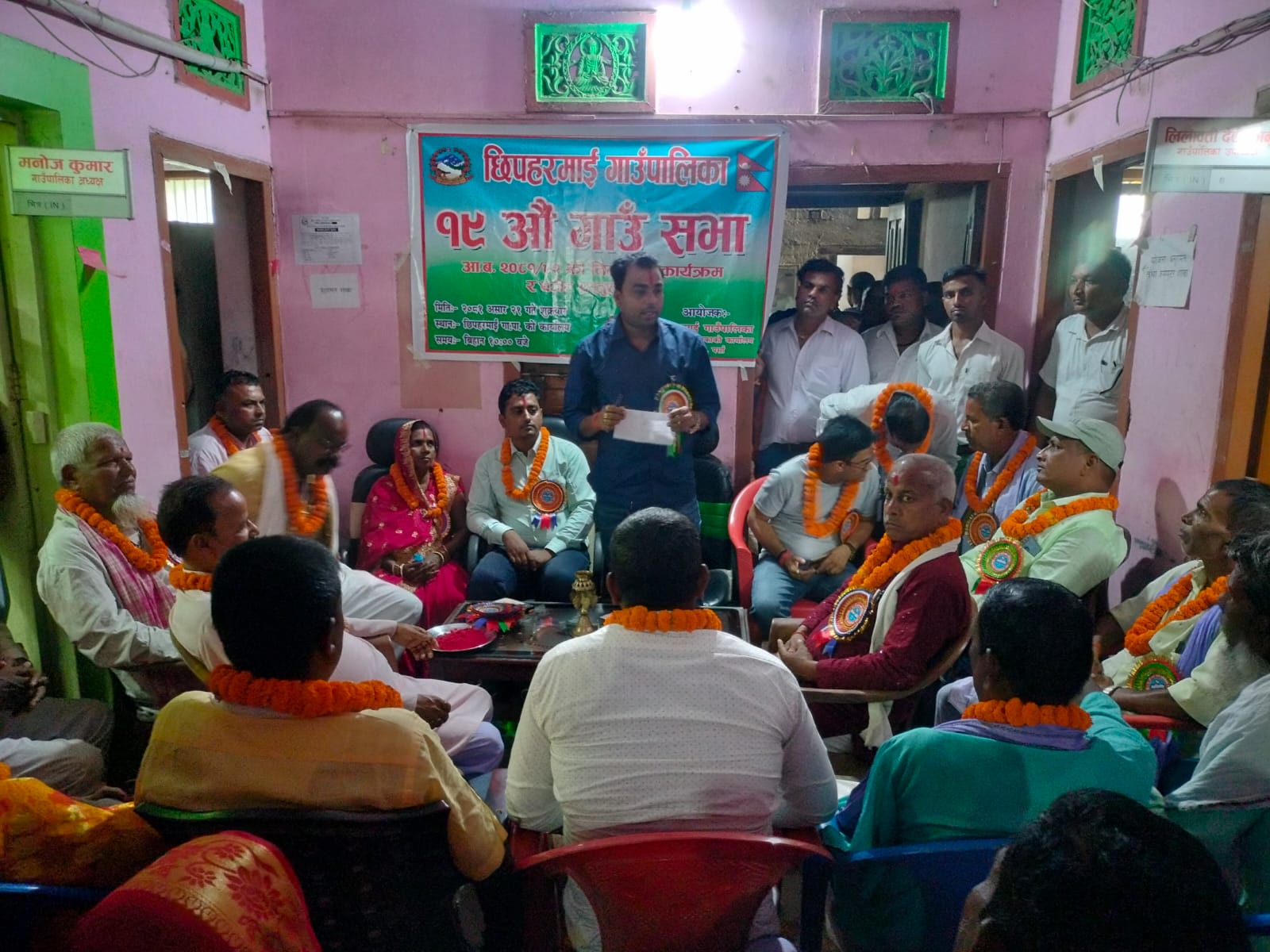 पर्सा जिल्लाको छिपहरमाई गाउँपालिकाको १९औँ गाउँ सभा सम्पन्न भएको छ । गाउँपालिकाको सभा हलमा शुक्रबार भएको गाउँ सभाको उद्घाटन गाउँपालिका अध्यक्ष मनोज कुमार गुप्ताले गरेका थिए । आर्थिक वर्ष २०८१÷०८२ का लागि ३७ करोड १७ लाख ५२ हजार रुपैयाँ बराबरको अनुमानित बजेट गाउँ सभाबाट नीति तथा कार्यक्रम प्रस्तुतिकरण गरेका थिए । गाउँ सभामा गाउँपालिकाको पाँचै वडाको योजना प्रस्तुत गरी पारित गरिएको छ ।