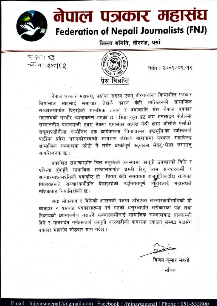 समाचार लेखेकै आरोपमा वीरगंजमा क्रियाशील पत्रकार जियालाल साहलाई धम्की आएपछि नेपाल पत्रकार महासंघ पर्साले विरोध गरेको छ ।