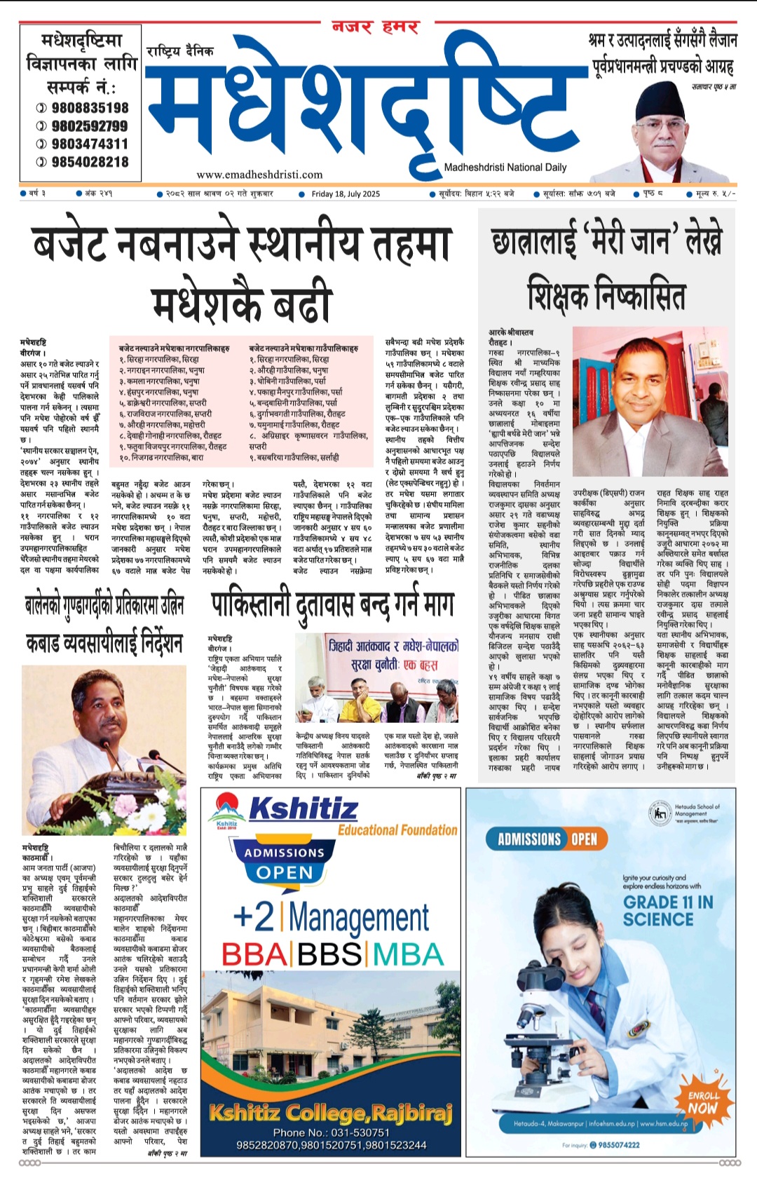 २०८२ साउन २ गतेकाे मधेशदृष्टि दैनिक