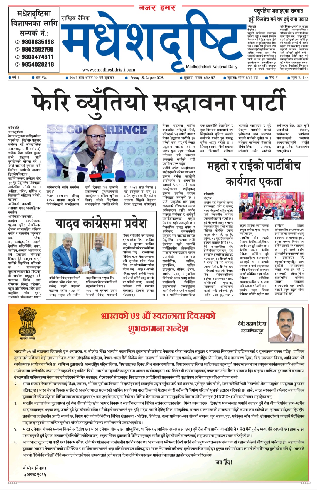 २०८२ साउन ३० गतेकाे मधेशदृष्टि दैनिक